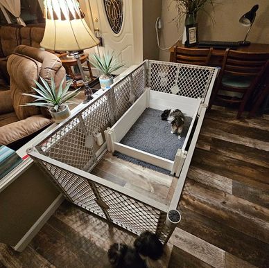 Our puppy pen changes and grows with the age of the puppy. The pen starts very small, but as the puppies are able to potty in the designated area, we increase the size of their pen until it is about 10' X 10'.